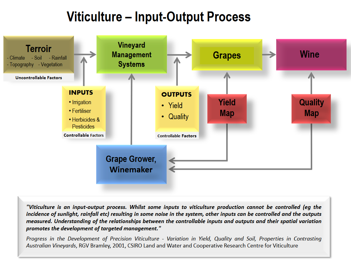 Η έρευνα δείχνει επίσης ότι η τεχνολογία Precision Viticulture (PV) στους αμπελώνες είναι πιο αποτελεσματική στη μέτρηση των χαρακτηριστικών των αμπελώνων απ ‘ό, τι οι γνώσεις των αμπελουργών σχετικά με το terroir δεδομένου ότι δεν είναι δυνατή η οπτική επιθεώρηση ολόκληρου του αμπελώνα.