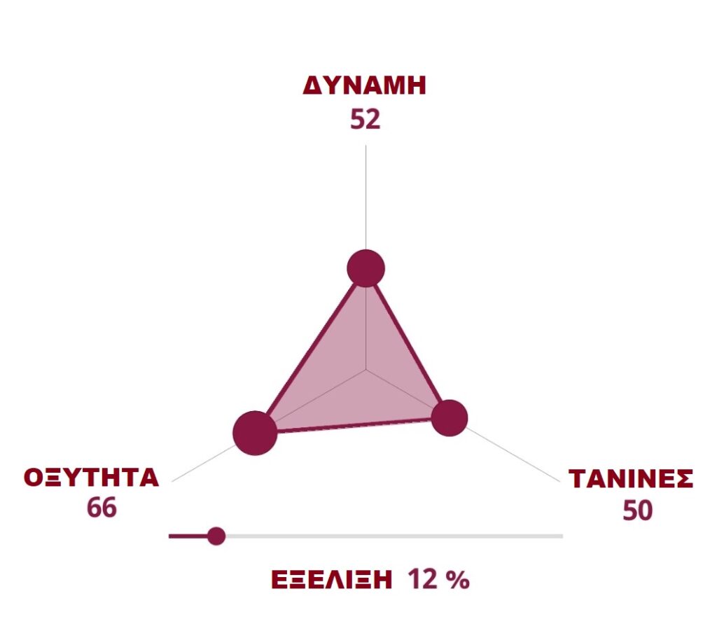 Λαμπερό ρουμπινί χρώμα. Στην μύτη αρώματα βιολέτας και μαύρων φρούτων του δάσους μαζί με μια λεπτή νότα βαρελιού. Στον ουρανίσκο μαύρα κεράσια, φρούτα του δάσους και μπαχαρικά. Μέτριο στρογγυλεμένο σώμα, δομημένες τανίνες και πολύ καλή οξύτητα. Επίγευση αρωματική με μακρύ τελείωμα. Πιείτε το τα επόμενα 5 χρόνια.